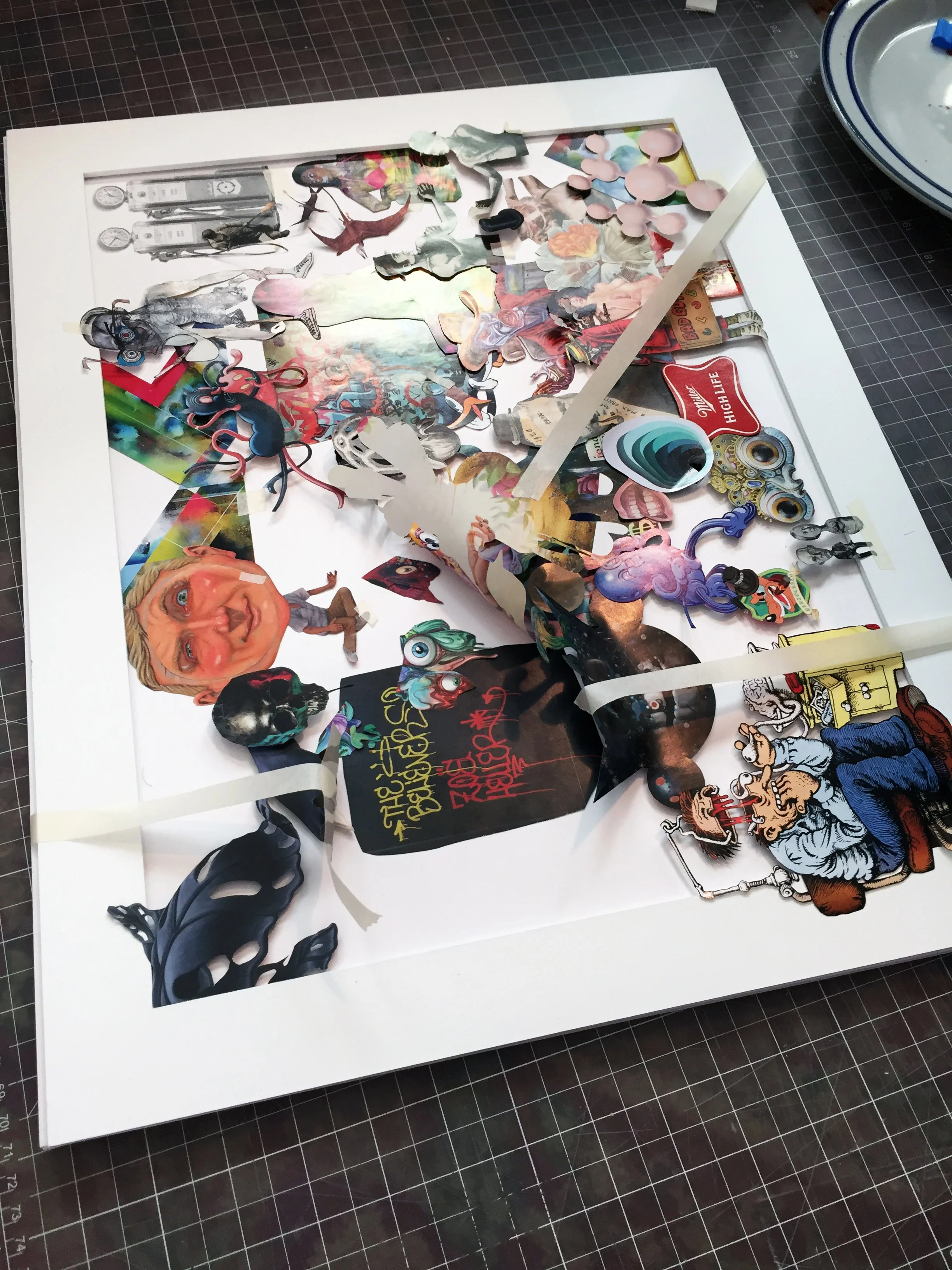 Shape, context, concept, color and spatial relationships are critical while striking a balance between the micro, macro and backdrop. This assemblage when all said and done, creates a cohesive visual explosion of what can be internalized as collage.
