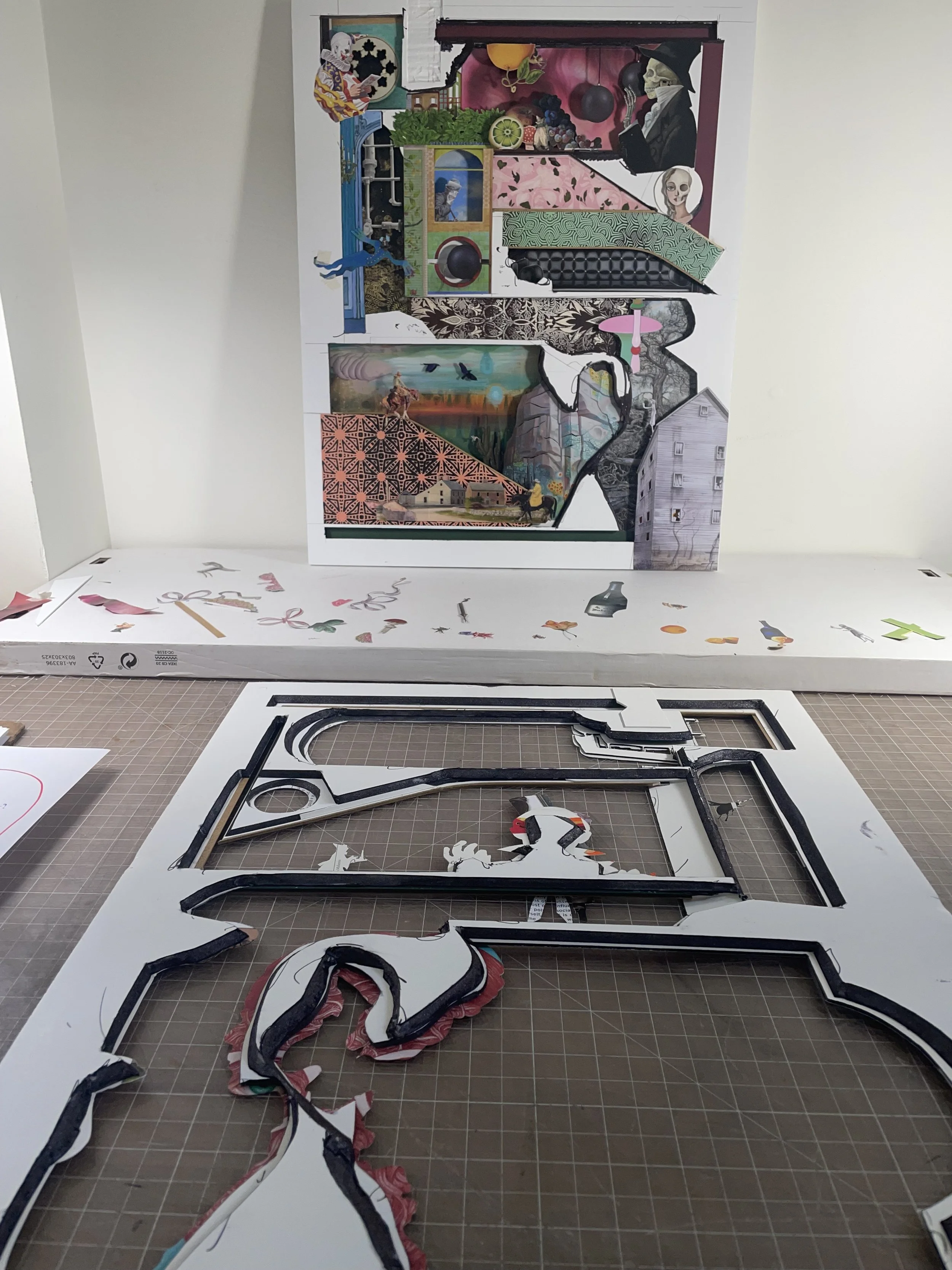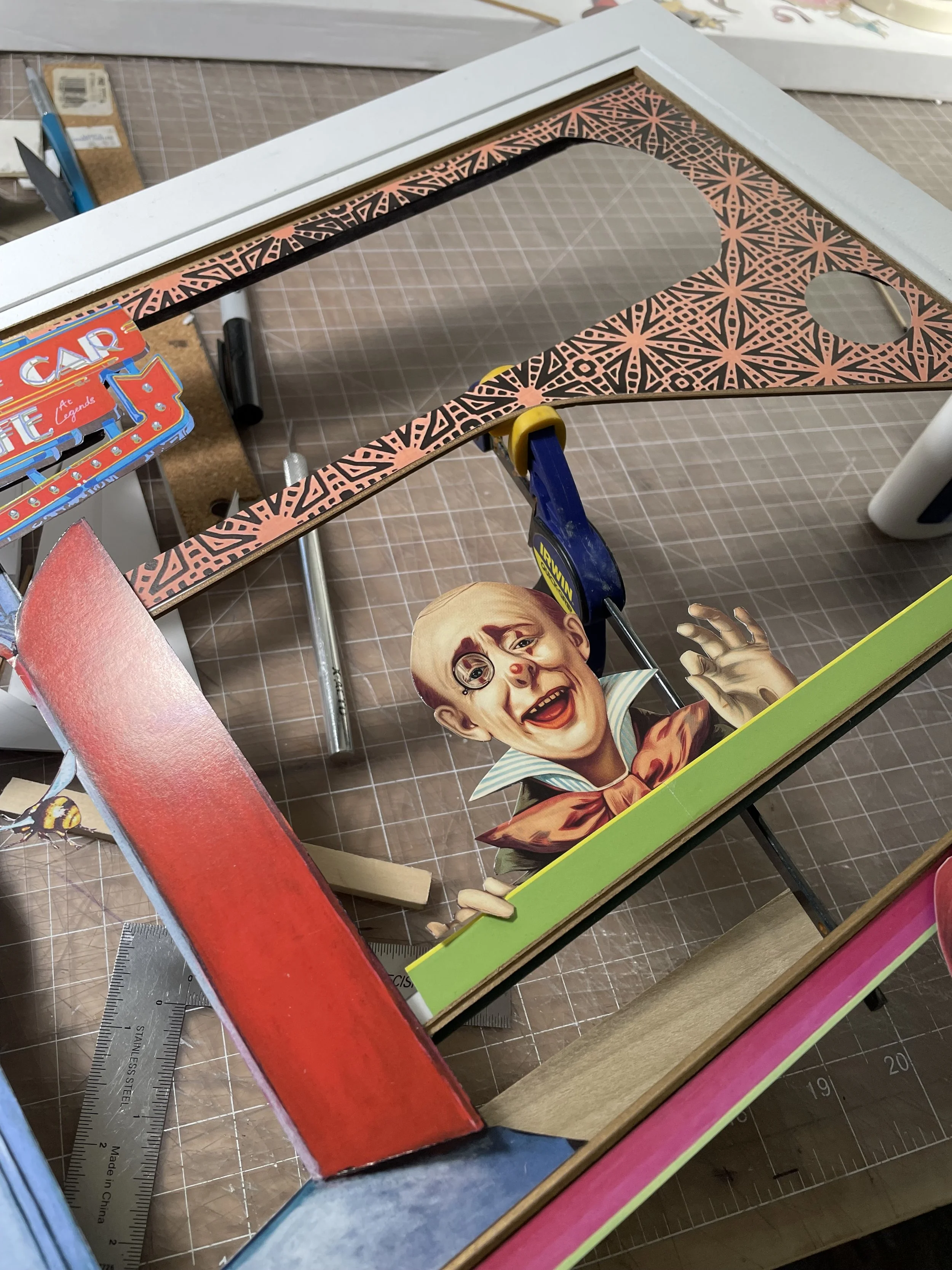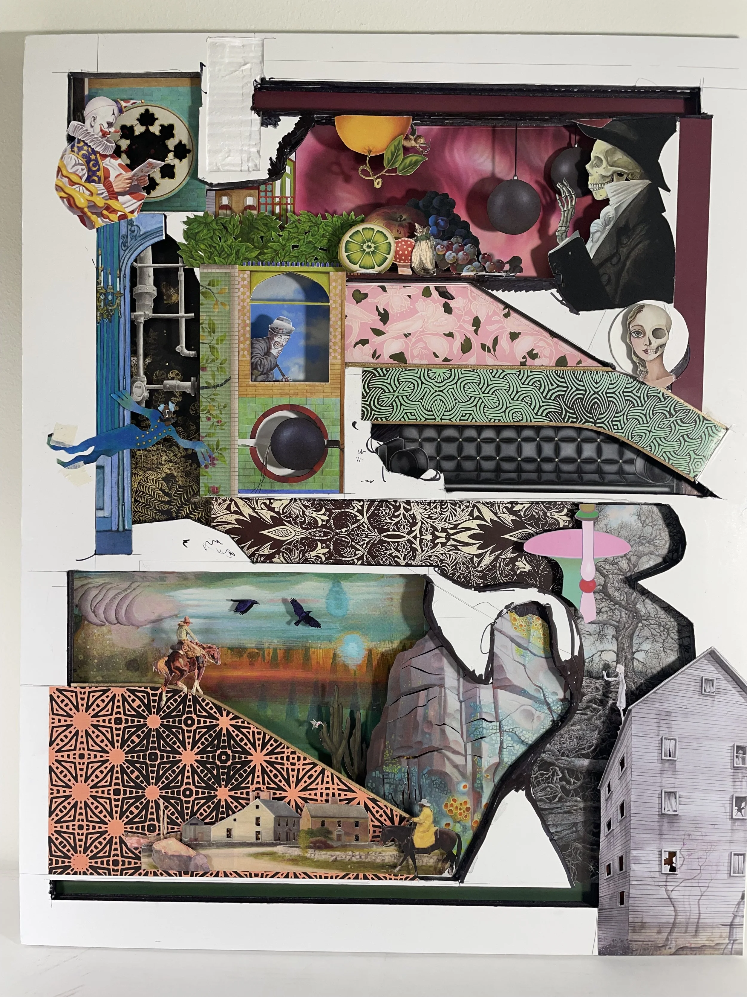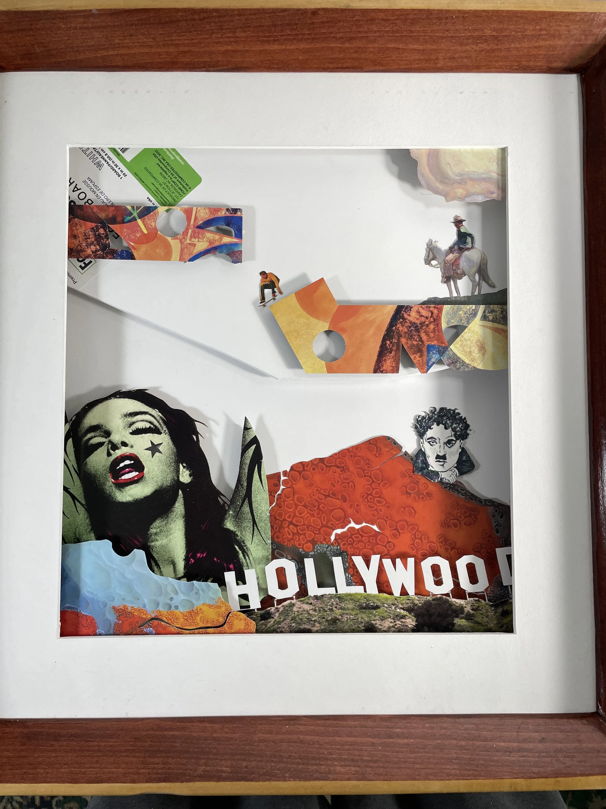 Each COLLAGE is created by layering an assemblage of images cut out by hand and structured with glue, tape and spray adhesive. The BACKING is a heavy gauge crescent board or foam core. The MATTING is cut and painted by hand or laser cut and painted by hand. The FRAMES are refurbished and also painted by hand.