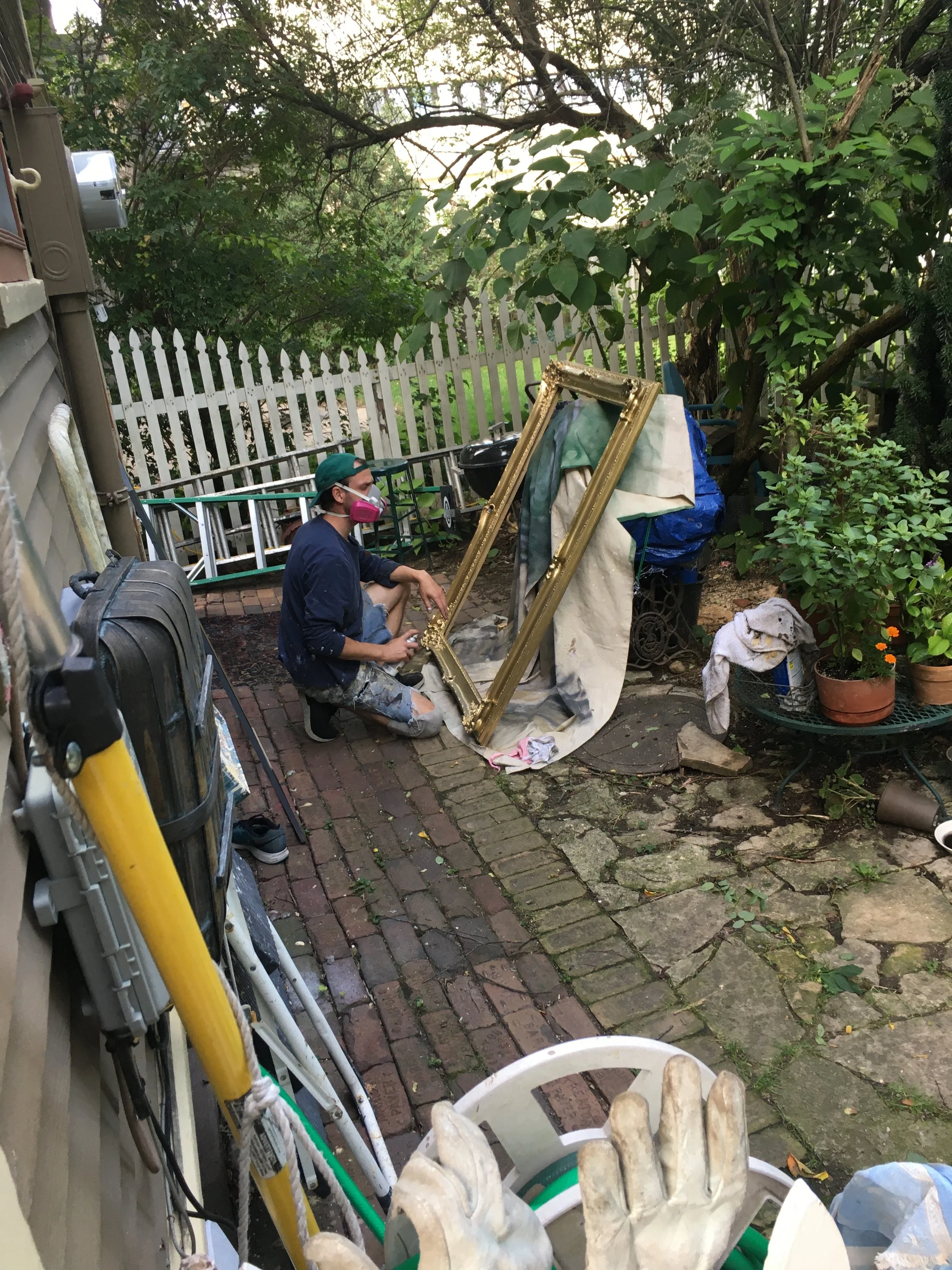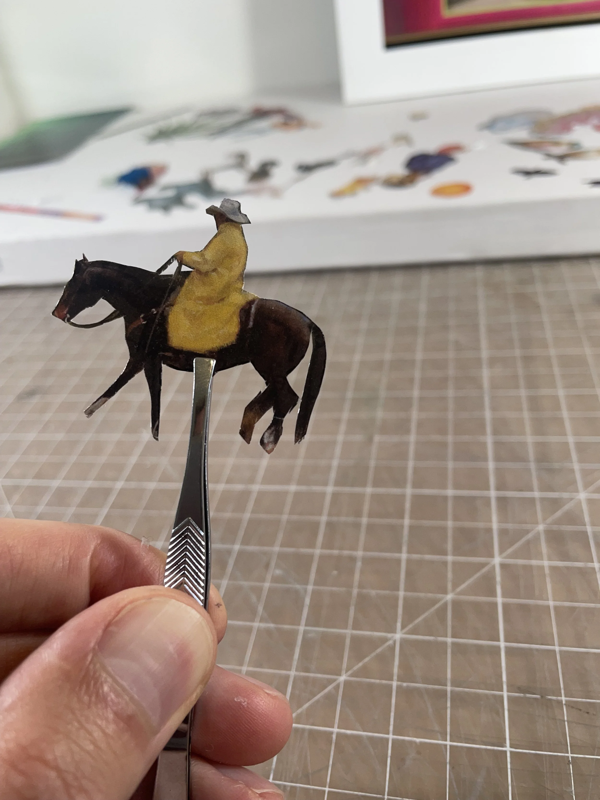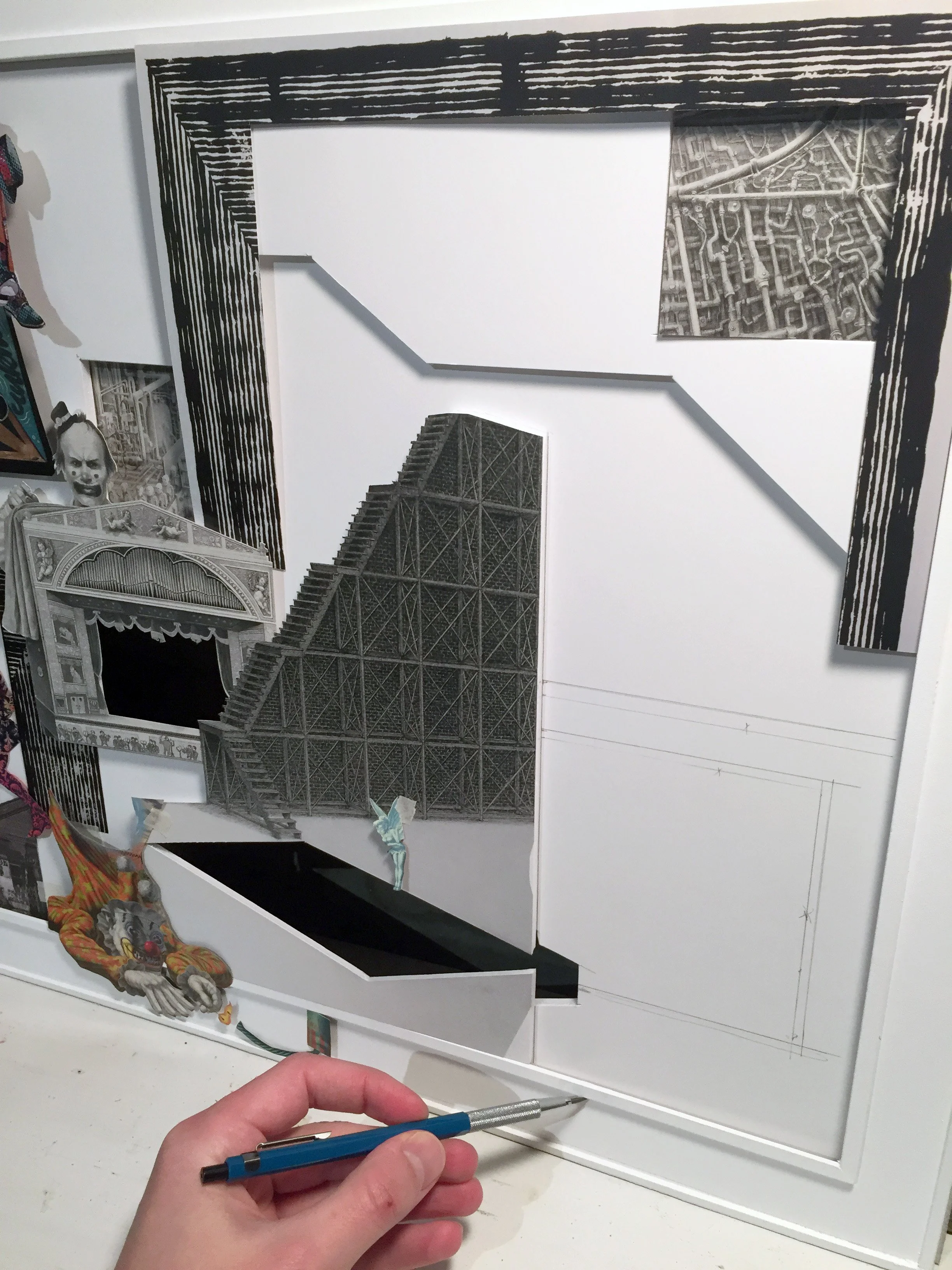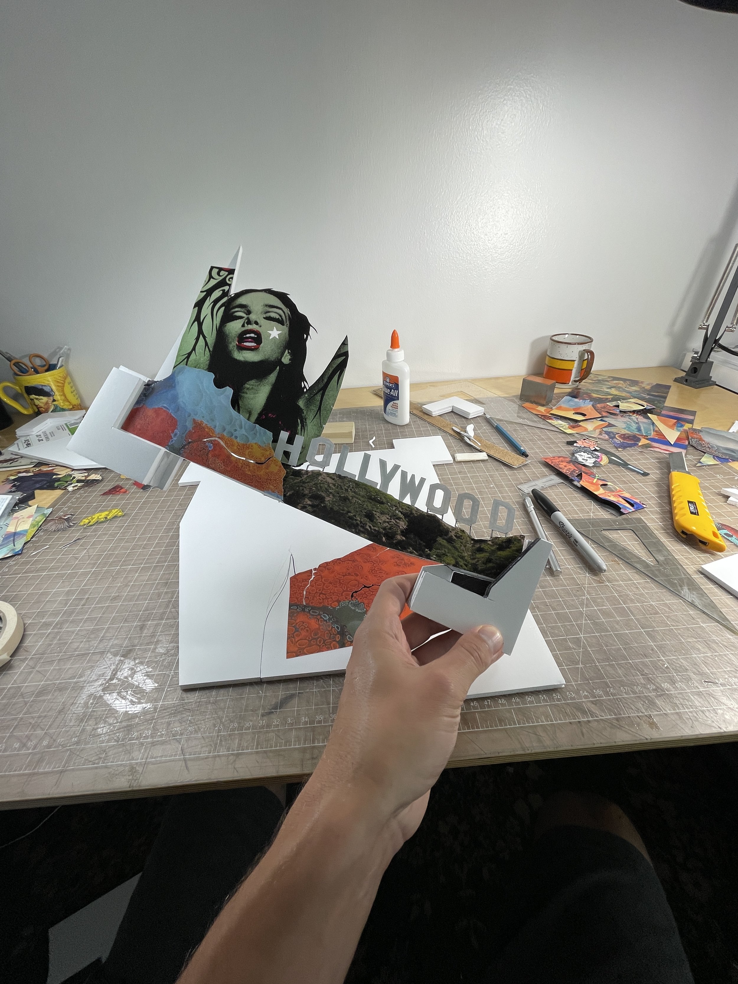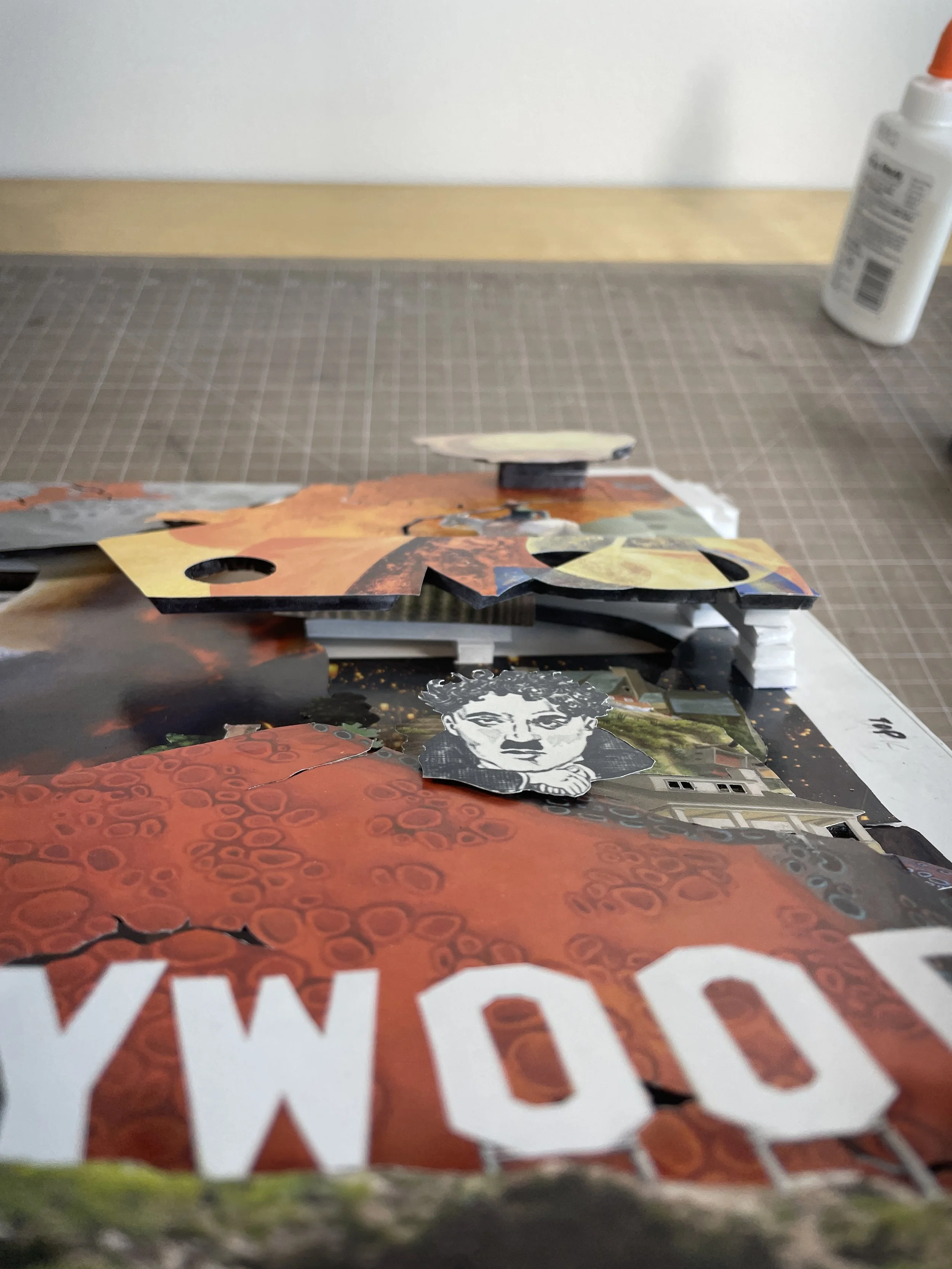 Each COLLAGE is created by layering an assemblage of images cut out by hand and structured with glue, tape and spray adhesive. The BACKING is a heavy gauge crescent board or foam core. The MATTING is cut and painted by hand or laser cut and painted by hand. The FRAMES are refurbished and also painted by hand.
